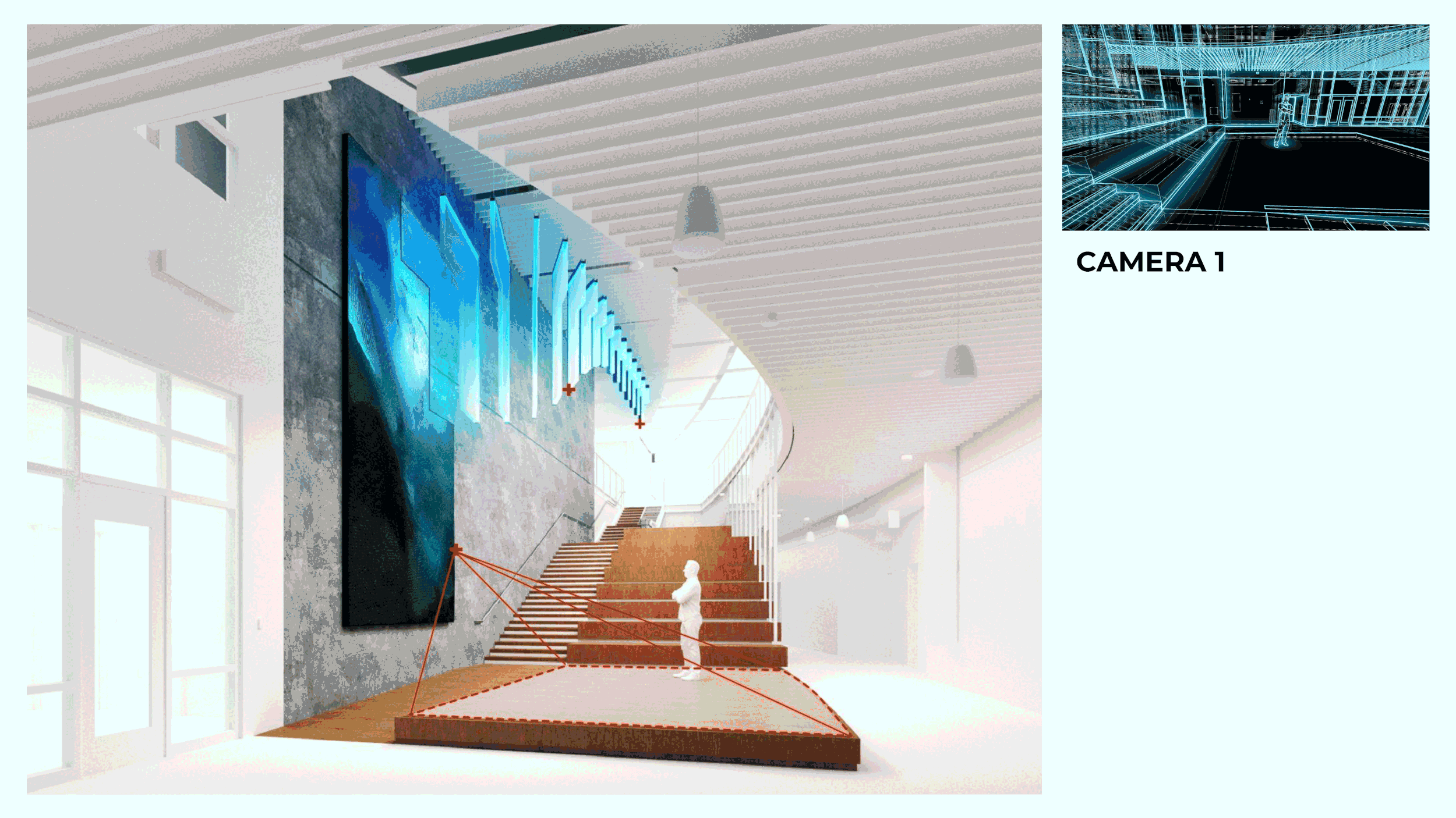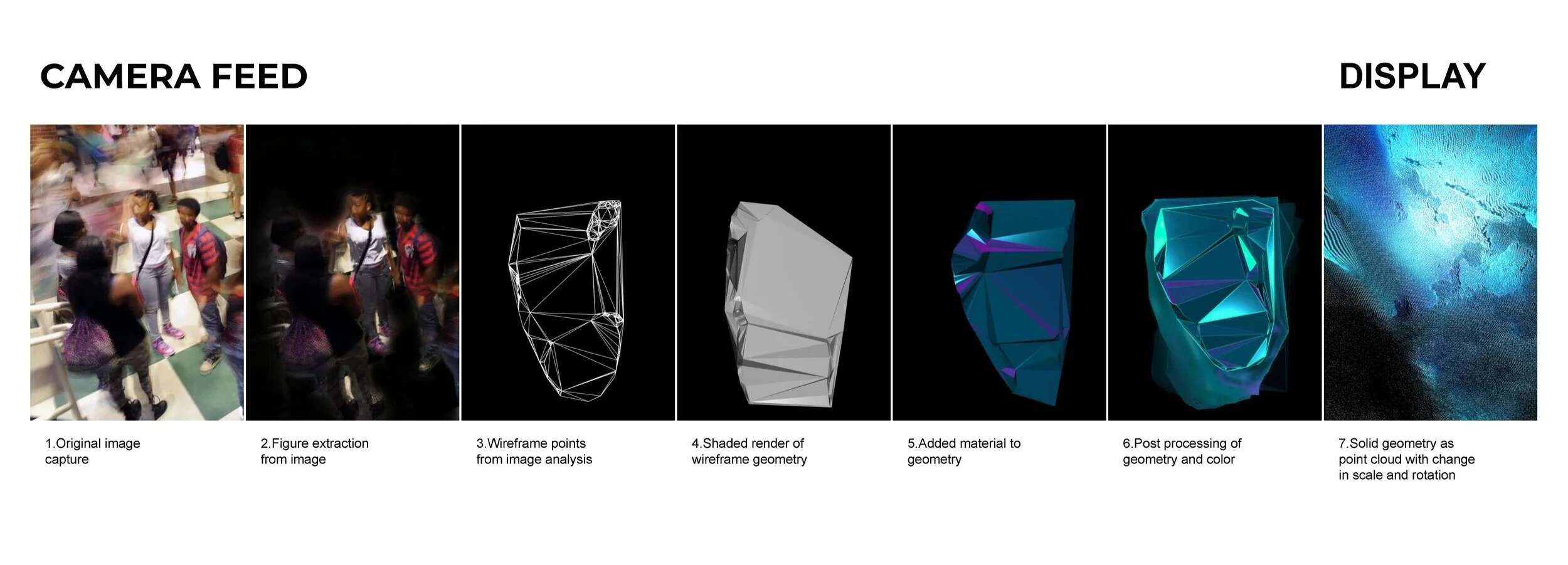 The artwork will consist of networked cameras which capture the interior space. The input from the cameras will be analyzed by a custom algorithm. The altered images will then displayed on the large screen which influences the color and patterns on the custom light fixtures.