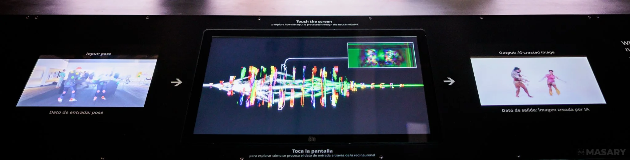 In the center of the console is an aestheticized rendering of the neural network. Data flows through the neural network from left to right, passing through a number of discrete layers, each made up of thousands or even millions of individual artificial neurons and each transforming the data in different ways. By touching the screen, one can select a given layer within the network for preview, displaying the output of the layer on-screen. Tracing the progress of the data through the network, it is possible to get a glimpse into the ways the network transforms the pose data into the final output image: resolution changes, becoming highly pixelated before rebuilding higher-resolution details, the dots produced by the pose estimator gradually disappear as the image transforms to contain more recognizable shapes and forms resembling human bodies.