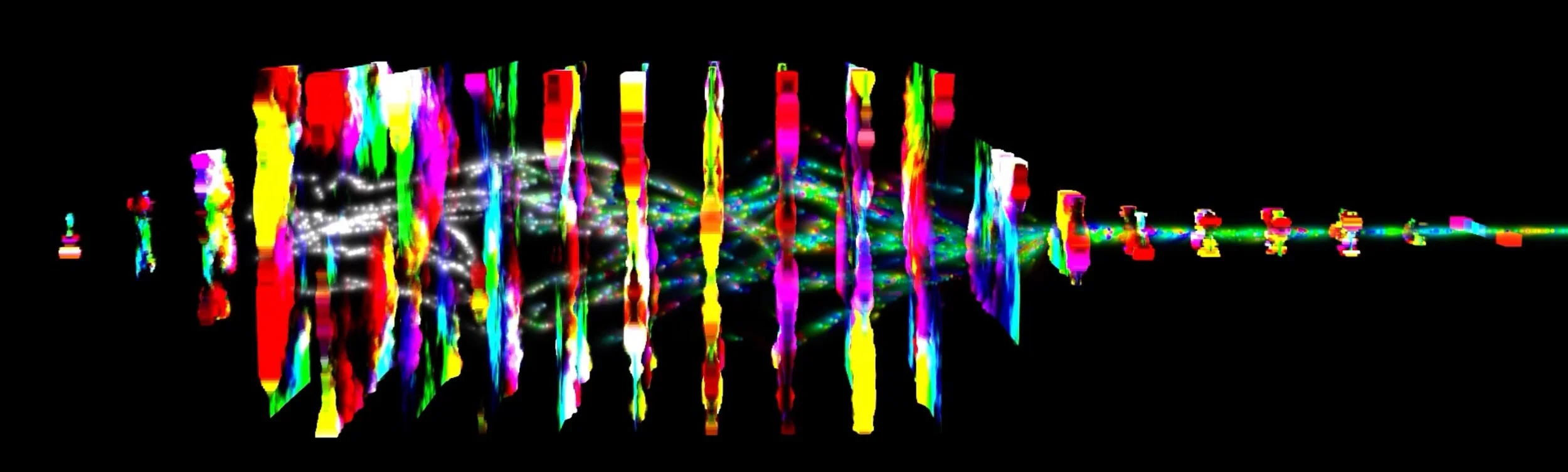 For Data Choreographics, we took several strategies for training the neural network. First, we trained separate models on footage from different dance troupes. This provides less variety in the training samples–instead of learning to generate images with the likeness of 20+ individuals, it's learning to generate images with the likeness of 1-6 dancers–which fits well with the reduced network size required for real-time application. We also trained several models on the entirety of the training set, resulting in less fine detail and much more abstract results.