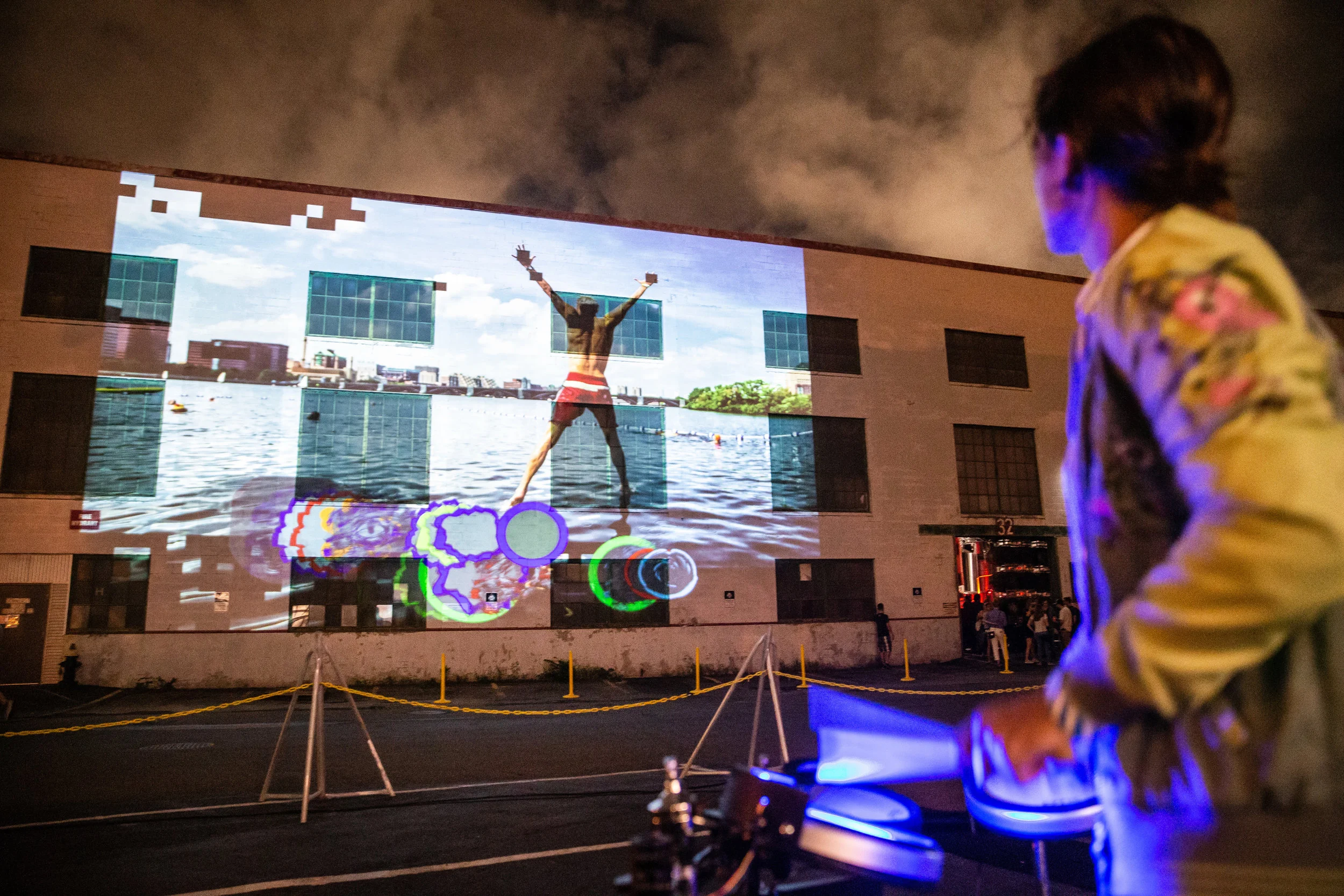 HD·BPM is an interactive, creative-engagement public artwork. In an accessible manner, participants walk up and play drum pads, playing along to original, danceable beats. The project strives to remove the common barriers of music-making and put musical creativity in the hands of everyone. As participants play the 3 sets of 3 electronic drum pads, the pads illuminate. Each stroke of the drum and coordinated colored light corresponds to a projected image, which is displayed adjacent to the music-making area. As the music continues, each drum stroke exposes a tile in the projected artwork, revealing - tile by tile - artworks by local visual artists. 2018 debut featured artists include Cedric Douglas, Ekua Holmes, Jordan Piantedosi, Cyrille Conan, The Safarani Sisters, Silvia Lopez Chavez, and Aram Boghosian.