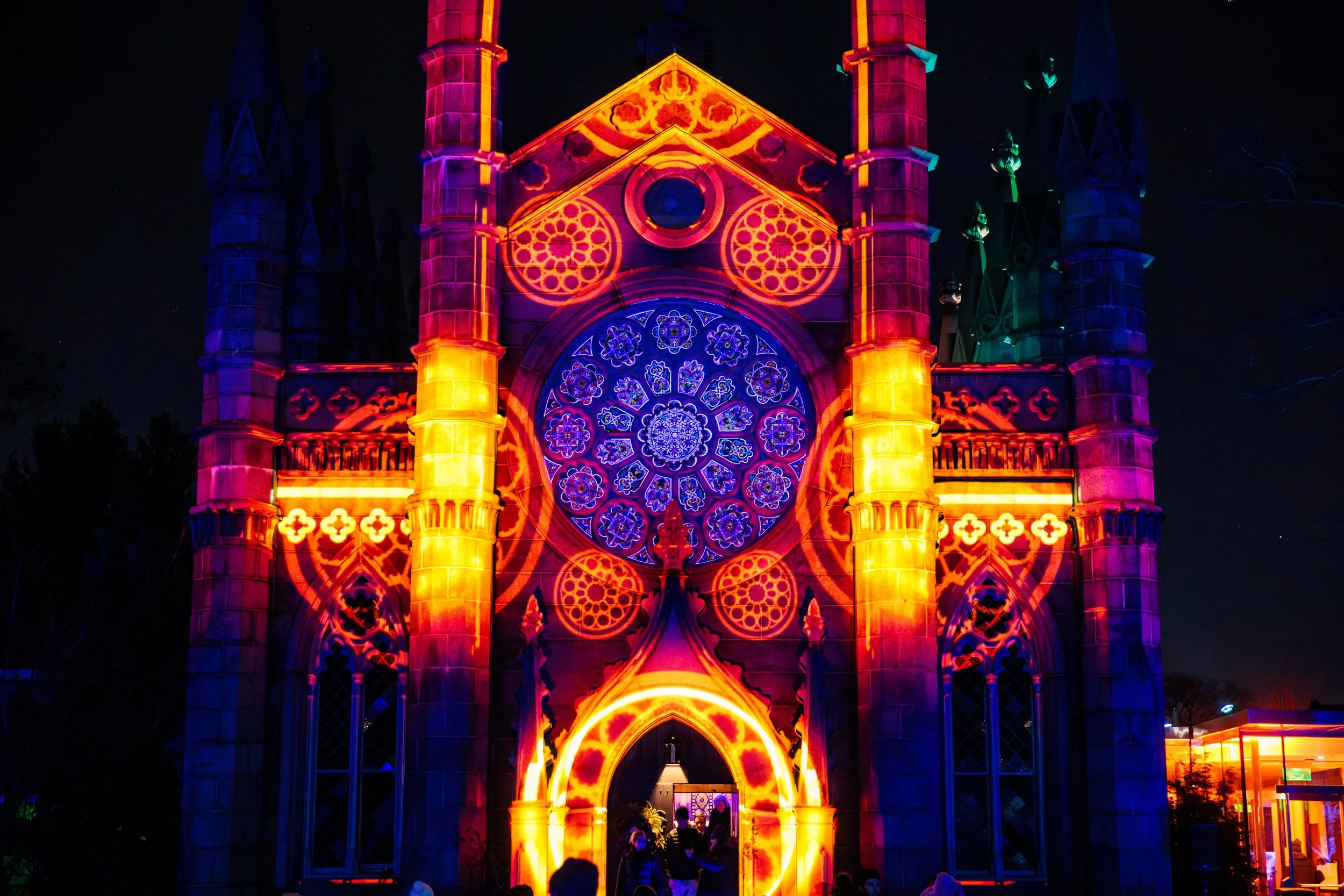 The prominent Bigelow Chapel facade is painted with animation and echoed with bespoke sounds to present two new site-specific audio visual pieces. Each artwork is inspired by the unique architecture, Mount Auburn Cemetery poetics, nature, and the winter solstice.
