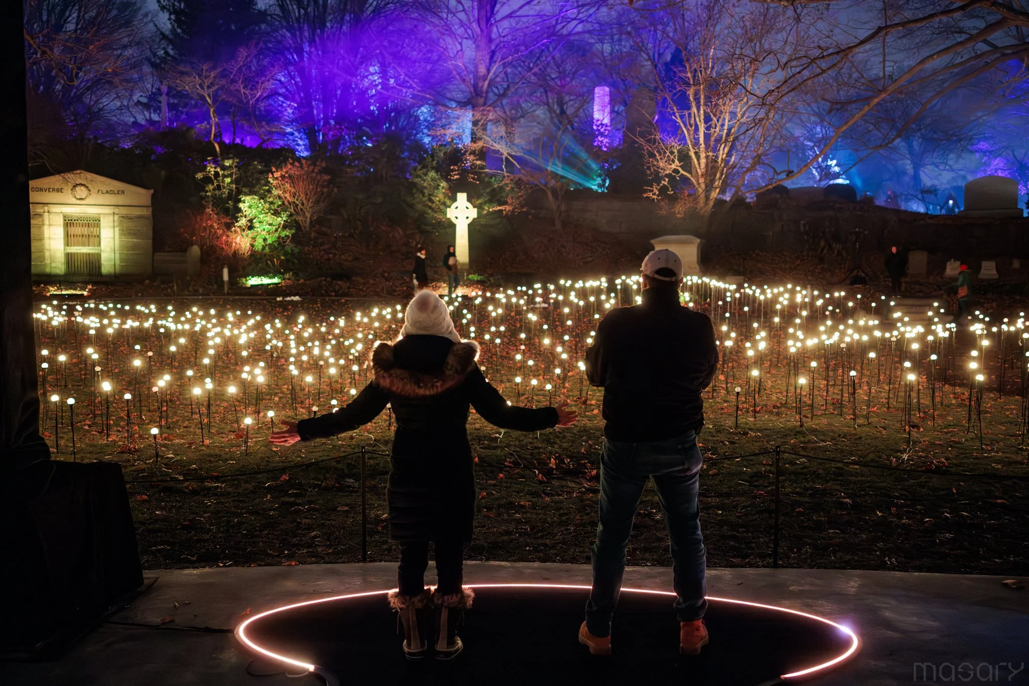 SOLSTICE is an evolution of the collaborative relationship MASARY started with Mount Auburn Cemetery in 2020 during the winter solstice to reimagine their traditions of light and darkness, remembrance, music, and connection to one’s life and the kaleidoscopic world. The tradition has continued, expanding the scale and imagination of what it means to return to SOLSTICE at Mount Auburn Cemetery.
