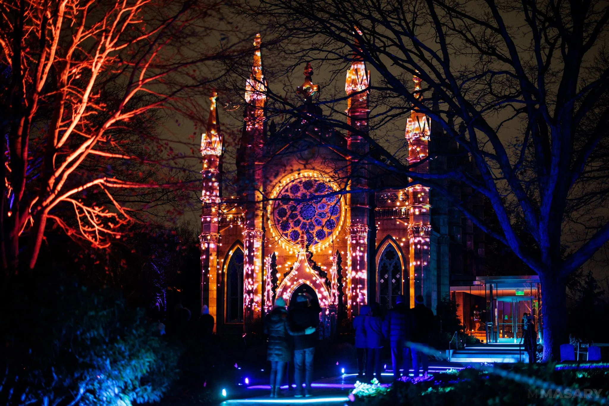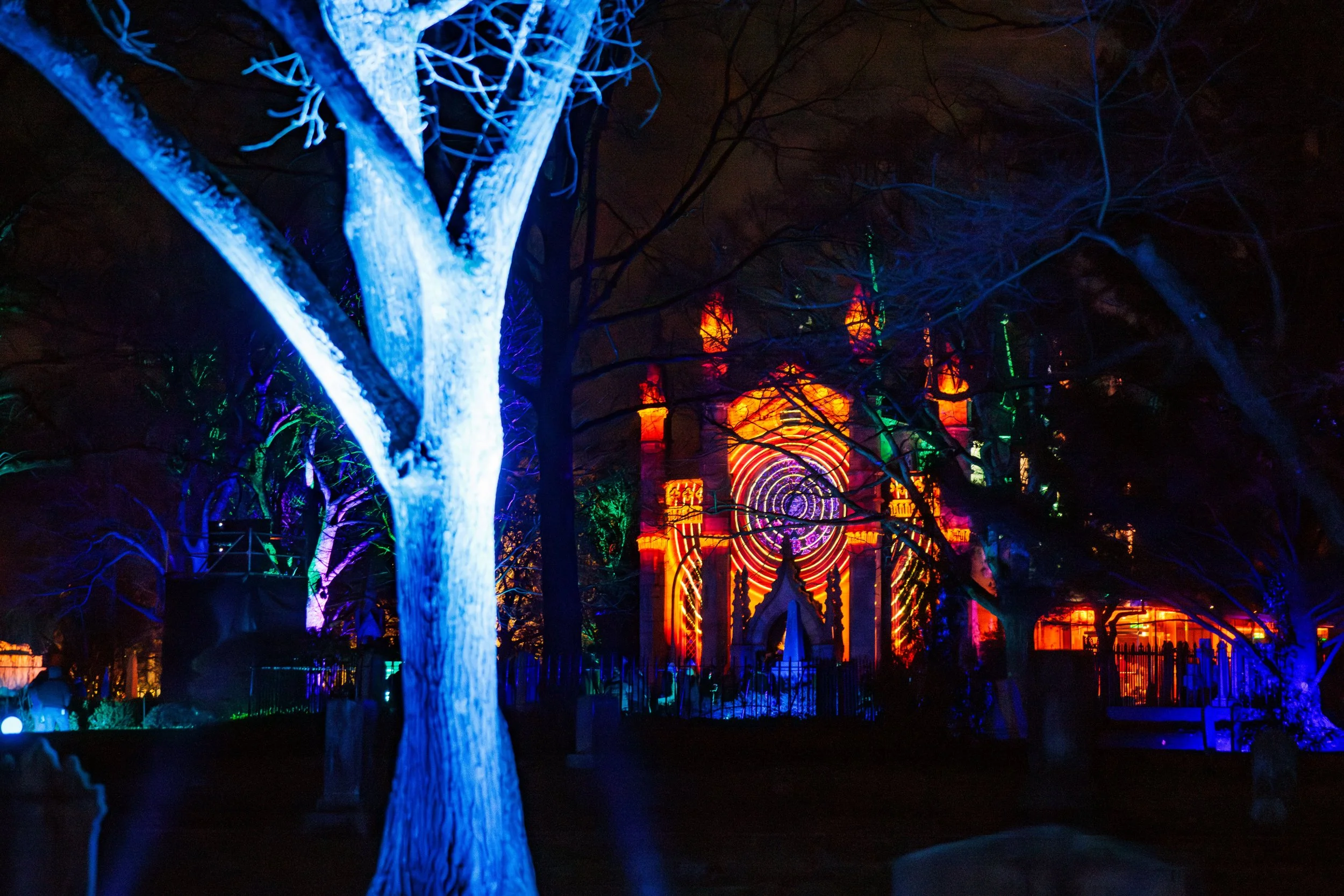 Binate explores embodying Bigelow Chapel as a spire & conductor of light and darkness, a chamber and instrument that both draws light from within it and emits it outward. While light is the main medium in concept & visual language, we must respect and acknowledge that light is only possible because of darkness. This piece is intended to hold that duality. Through visual poetic gestures within the architecture and the original sound composition of LEYA, this piece is aimed to express duality for guests to be able to find their own moment within that binate spectrum.