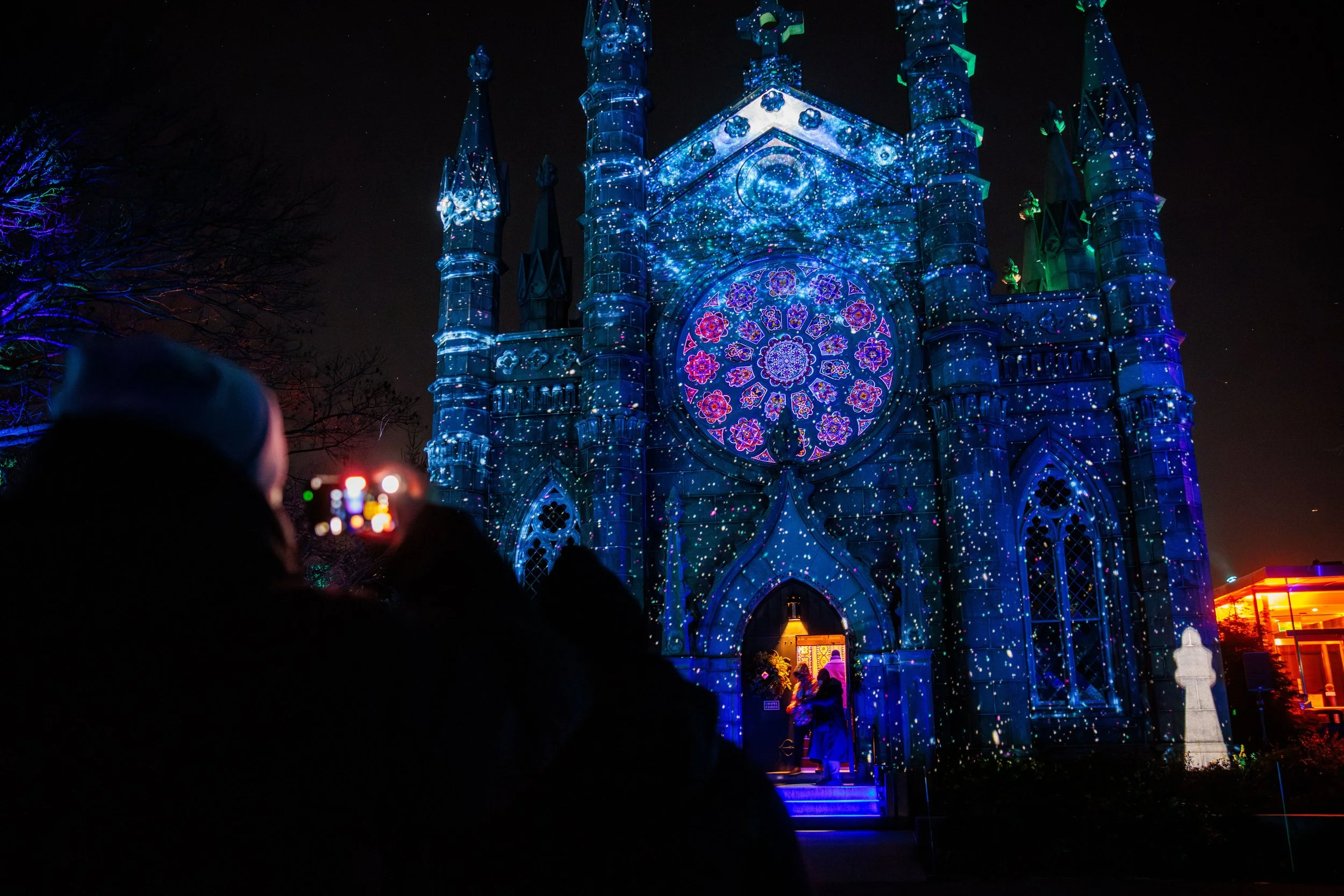Microcosm is an audio visual installation presented on the Bigelow Chapel at Mount Auburn Cemetery. Part of SOLSTICE 2023, the piece uses the unique architecture of the facade to conduct a poem to the stars. The work is a gentle and transformative gesture as it brings one intimately closer to the stars and allows one to be carried through the building transformation itself.