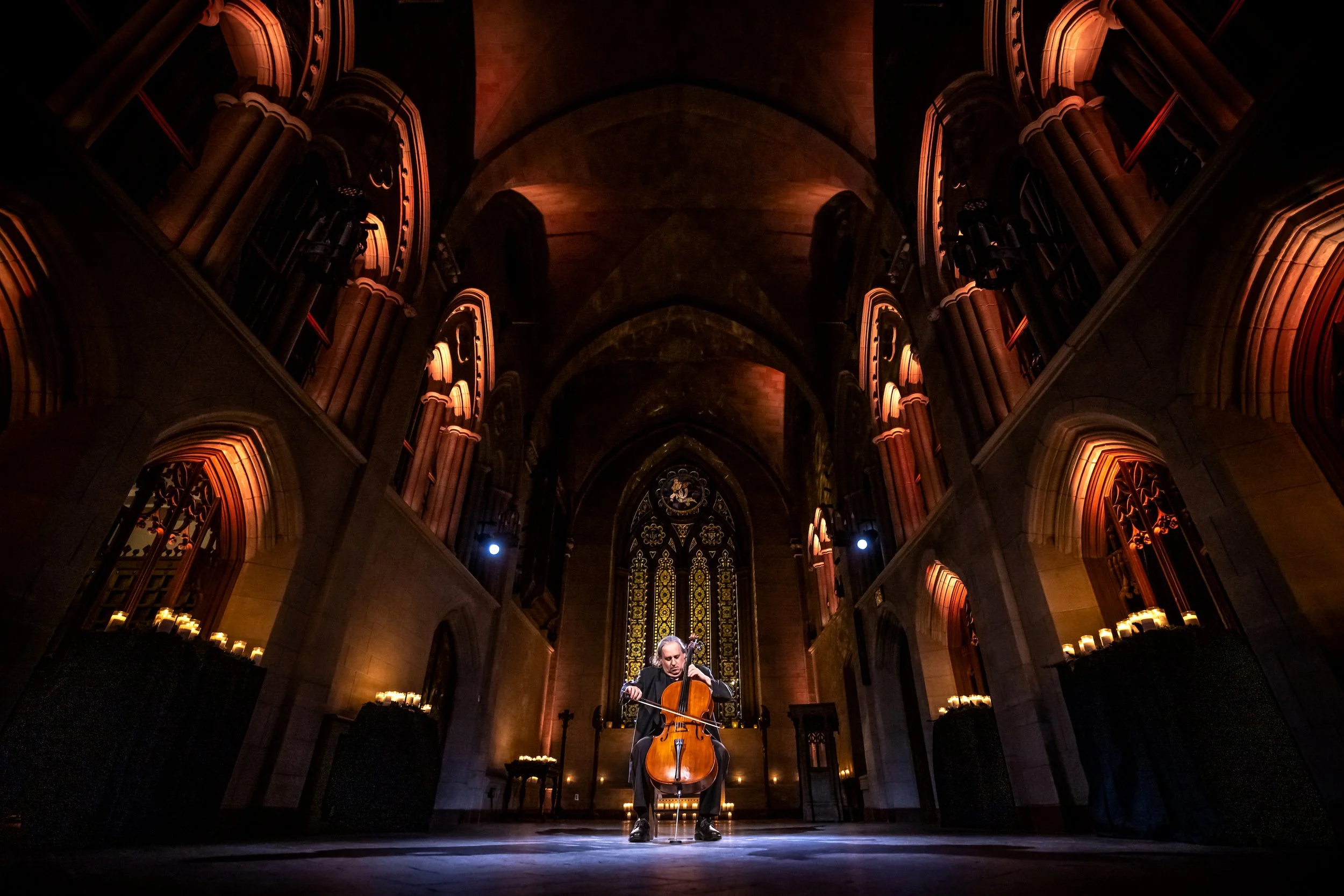 Rob Bethel performing inside Bigelow Chapel for the opening of the live-broadcast of SOLSTICE in 2020 - Photo by Aram Boghosian