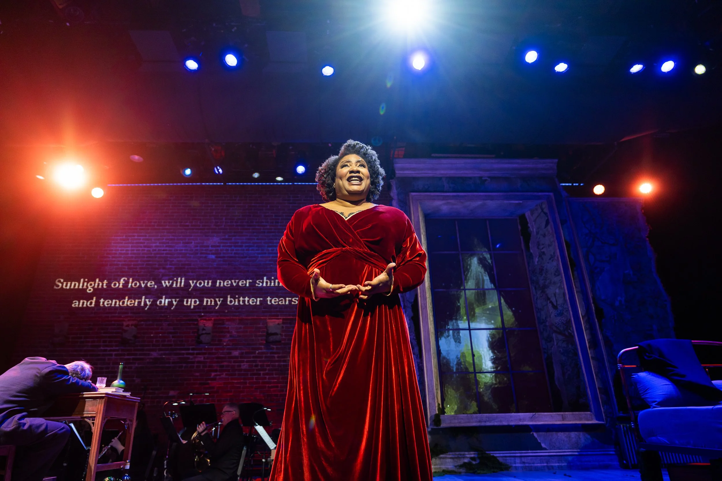 Raehann Bryce-Davis singing with supertitles on the left and scenic elements on the right.