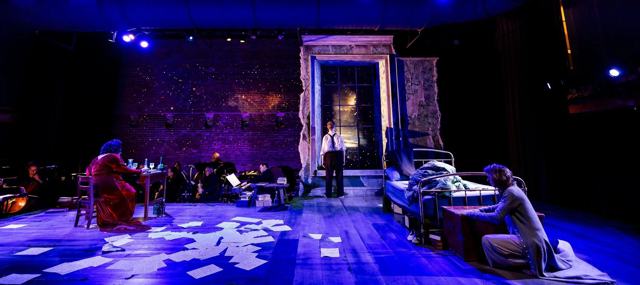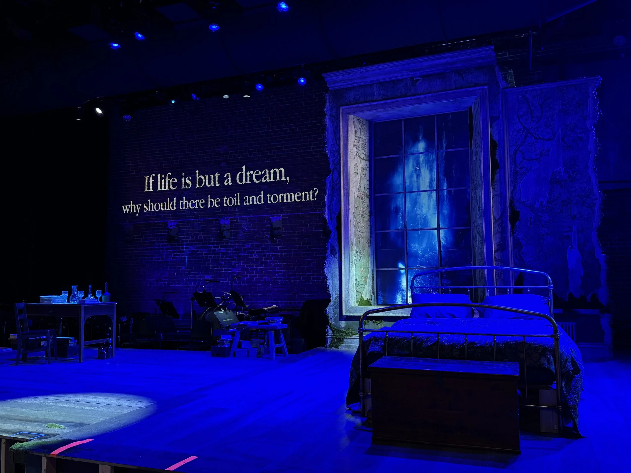 Anne very wisely had determined early that the piece needed a window, so the set featured a desk, a bed, and a window. The window became an opportunity to explore place, to travel with the audience, to obscure, to dissolve what we would see together, perhaps including the audience more deeply in the various journeys underway on the stage. We did this with a ground-mounted projection system casting onto a liquid crystal film material (funny story there, if you catch me IRL) that can switch between being be transparent or opaque instantly - allowing for a “snap” between a dream, a vision, and then “snap” right back into the room.